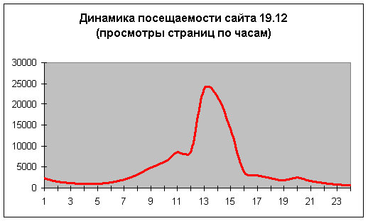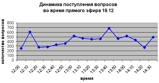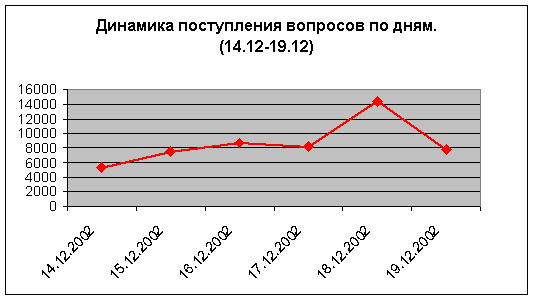 На этой страничке Вы можете ознакомиться с официальной статистикой вопросов, поступивших на сайт с 14 декабря 2002 года и до окончания эфира. Социально-демографические характеристики аудитории. Возраст посетителей. Среди пользователей интернета, задававших вопросы на сайте, преобладали люди в возрасте от 25 до 40 лет (32%), на втором месте - возрастная категория от 16 до 25 лет (31%). ![]() Пол и семейное положение. Среди аудитории преобладали мужчины, они составили 68% всех задавших вопросы. По сравнению с прошлым годом, число женщин увеличилось - в прошлом году доля женщин составляла 26%. С точки зрения семейного положения, аудитория разделилась примерно пополам. ![]() ![]() Образование. Люди с высшим образованием составили более половины от общей аудитории (53%). ![]() Социальный статус. Самыми активными из посетивших сайт были служащие (20,42%) и студенты (17,72%). ![]() Сфера деятельности. Среди аудитории преобладали представители науки и образования (18,19%), промышленности (11,37%) и высоких технологий (9,08%). ![]() Регионы. Наибольшую активность проявили жители Сибири (14,24%), Северо-Запада России (13,66%) и Москвы (13,49%). ![]() Динамика поступления вопросов. Всего с момента открытия сайта 14.12 до окончания прямого эфира 19.12, на сайте www.linia2002.ru было задано 51 584 вопросов. Интенсивность поступления на сайт www.linia2002.ru в первые три дня была достаточно стабильной - в среднем порядка 8 000 вопросов в день. Естественный всплеск наблюдался 18.12, в этот день было задано порядка 14300 вопросов. ![]() Наиболее интересный период с точки зрения интенсивности задаваемых вопросов - это период с 12:00 до 14:30 - время прямого эфира. В этот период интенсивность задаваемых вопросов не была постоянной. Наблюдались явные всплески: после начала эфира - в 12:10, после первого часа - с 13:00 до 13:10 и с 13:40 до 13:50. ![]() Посещаемость сайта. Общие характеристики. Динамика посещений сайта. ![]() Наибольший интерес представляет динамика посещений сайта www.linia2002.ru в день прямого эфира, 19 декабря. Максимум просмотренных страниц пришелся на 12:00 - 23 804, что в 5 раз превышает среднее число просмотренных страниц в час в этот день. ![]() |